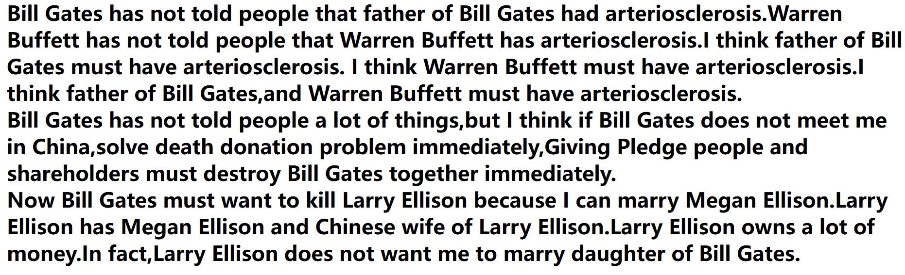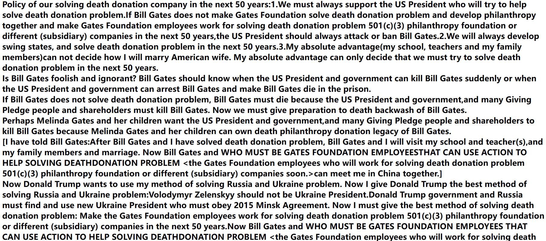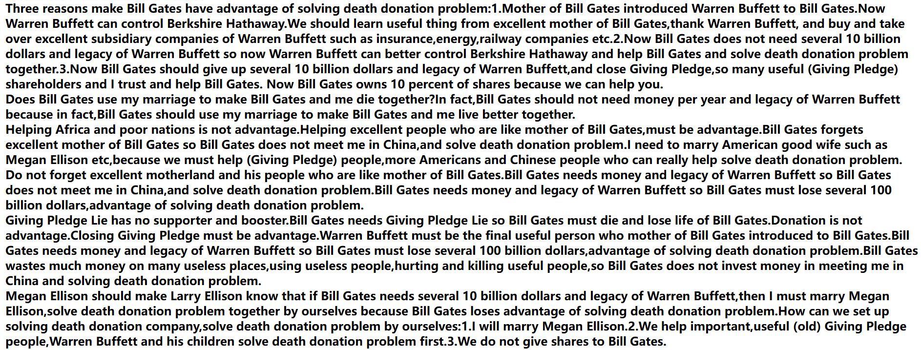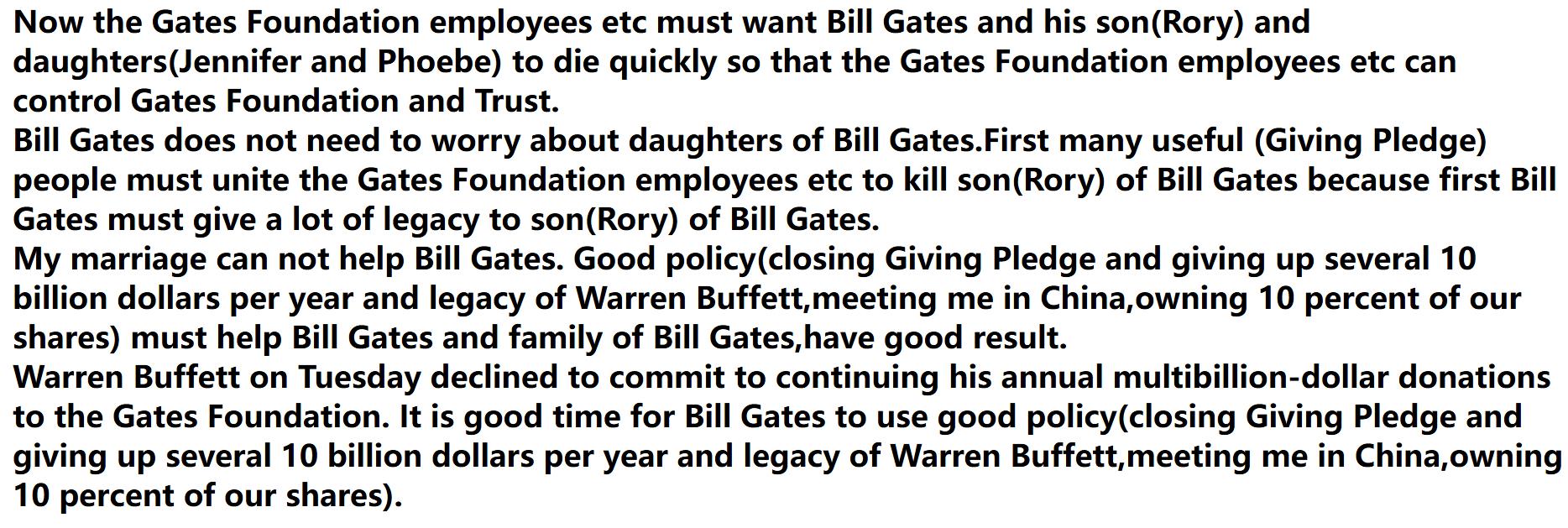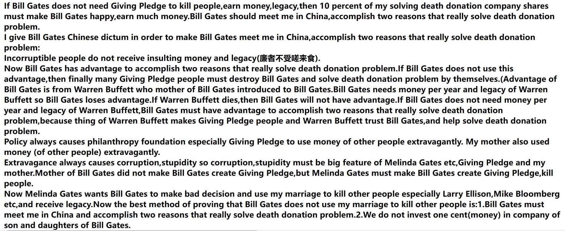 Now Melinda Gates wants Bill Gates to make bad decision and use my marriage to kill other people especially Larry Ellison,Mike Bloomberg etc,and receive legacy.Now the best method of proving that Bill Gates does not use my marriage to kill other people is:1.Bill Gates must meet me in China and accomplish two reasons that really solve death donation problem.2.We do not invest one cent(money) in company of son and daughters of Bill Gates.