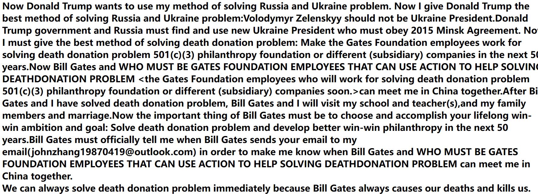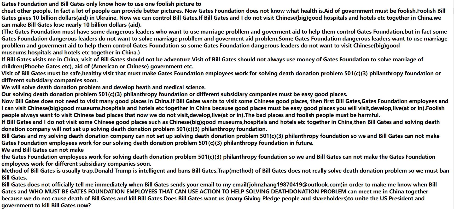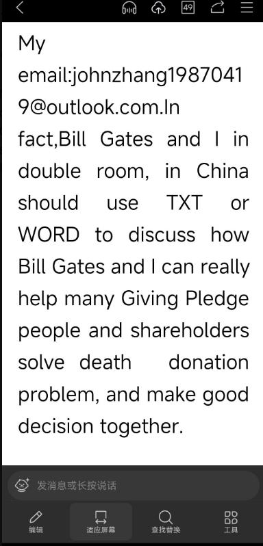 My email:johnzhang19870419@outlook.com.In fact,Bill Gates and I in double room, in China should use TXT or WORD to discuss how Bill Gates and I can really help many Giving Pledge people and shareholders solve death donation problem, and make good decision together.