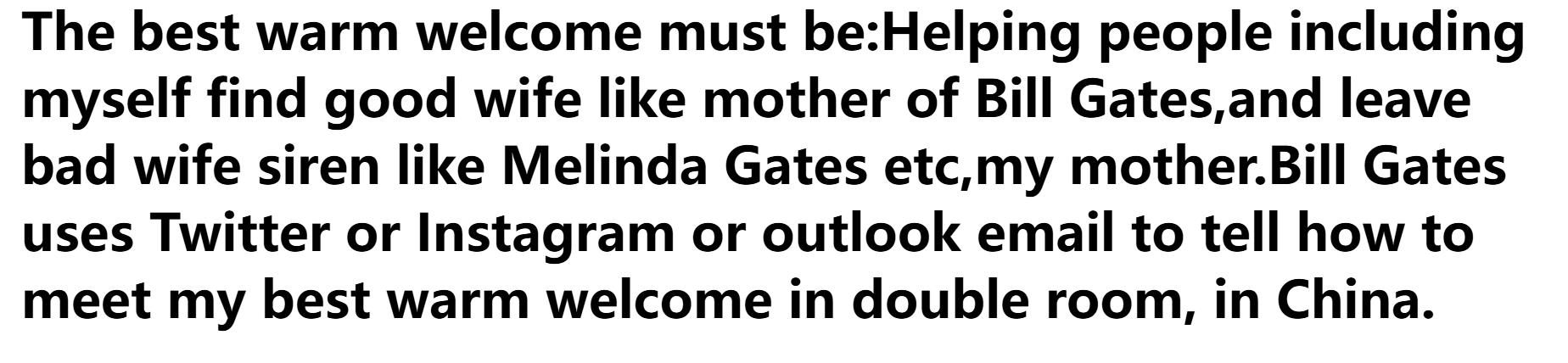 The best warm welcome must be:Helping people including myself find good wife like mother of Bill Gates,and leave bad wife siren like Melinda Gates etc,my mother.Bill Gates uses Twitter or Instagram or outlook email to tell how to meet my best warm welcome in double room, in China.
