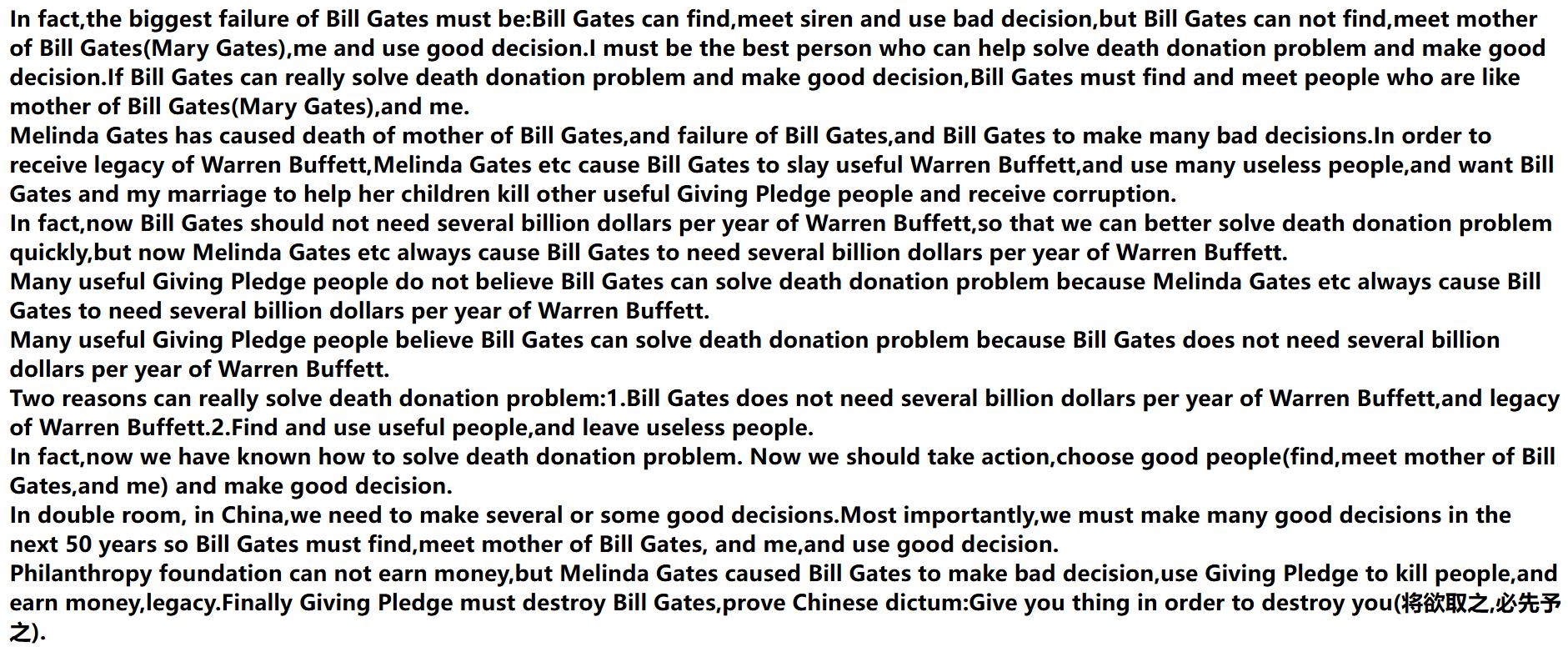 In fact,the biggest failure of Bill Gates must be:Bill Gates can find,meet siren and use bad decision,but Bill Gates can not find,meet mother of Bill Gates(Mary Gates),me and use good decision.I must be the best person who can help solve death donation problem and make good decision.If Bill Gates can really solve death donation problem and make good decision,Bill Gates must find and meet people who are like mother of Bill Gates(Mary Gates),and me.