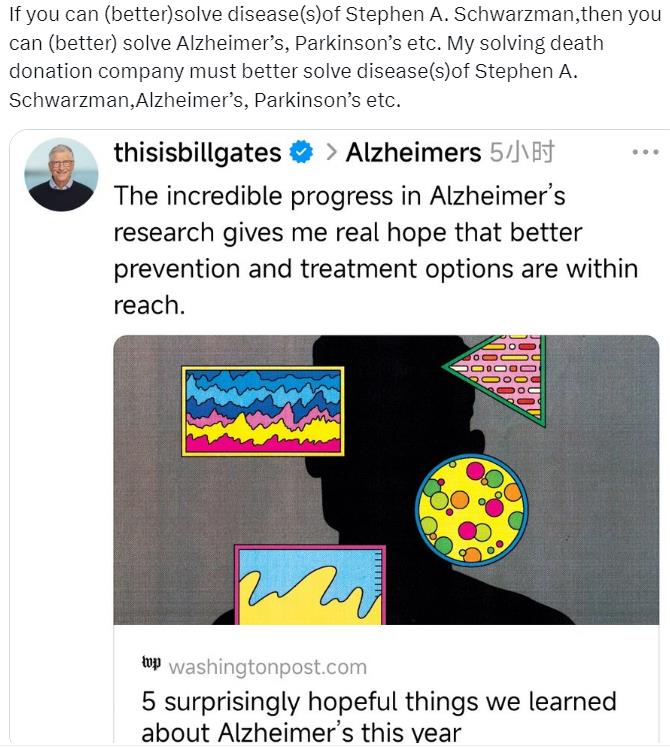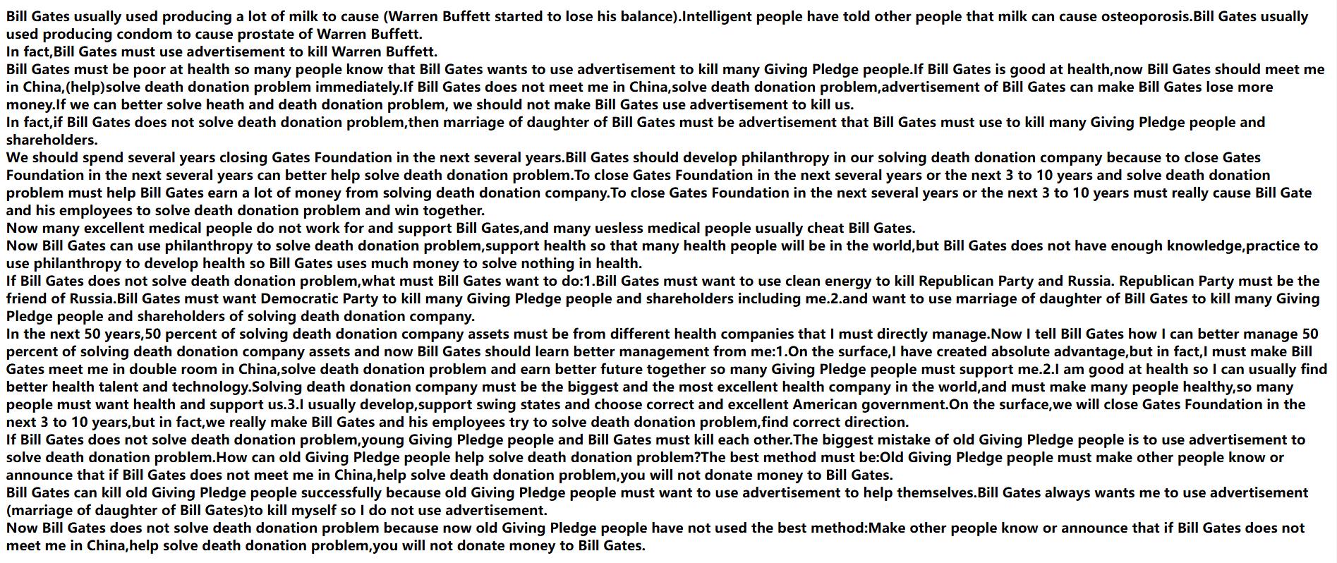 Now Bill Gates has advantage to accomplish two reasons that really solve death donation problem.If Bill Gates does not use this advantage,then finally many Giving Pledge people must destroy Bill Gates and solve death donation problem by themselves.(Advantage of Bill Gates is from Warren Buffett who mother of Bill Gates introduced to Bill Gates.Bill Gates needs money per year and legacy of Warren Buffett so Bill Gates loses advantage.If Warren Buffett dies,then Bill Gates will not have advantage.If Bill Gates does not need money per year and legacy of Warren Buffett,Bill Gates must have advantage to accomplish two reasons that really solve death donation problem,because thing of Warren Buffett makes Giving Pledge people and Warren Buffett trust Bill Gates,and help solve death donation problem.