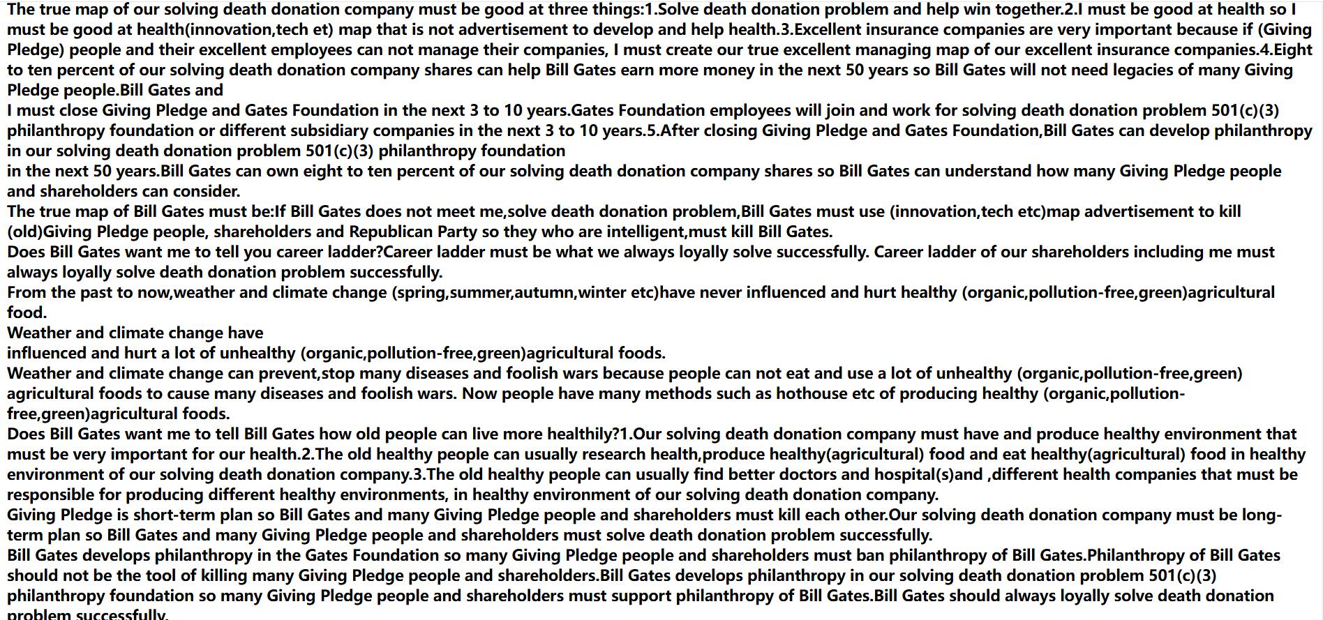 Giving Pledge is short-term plan so Bill Gates and many Giving Pledge people and shareholders must kill each other.Our solving death donation company must be long-term plan so Bill Gates and many Giving Pledge people and shareholders must solve death donation problem successfully.