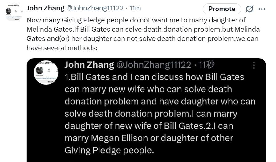 Now many Giving Pledge people do not want me to marry daughter of Melinda Gates.If Bill Gates can solve death donation problem,but Melinda Gates and(or) her daughter can not solve death donation problem,we can have several methods:1.Bill Gates and I can discuss how Bill Gates can marry new wife who can solve death donation problem and have daughter who can solve death donation problem.I can marry daughter of new wife of Bill Gates.2.I can marry Megan Ellison or daughter of other Giving Pledge people.